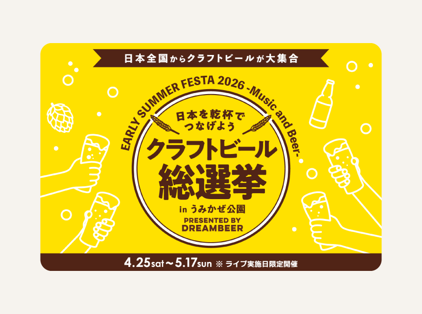 クラフトビール総選挙inうみかぜ公園 2026年4月25日(土)~5月17日(日) 開催場所:うみかぜ公園 詳細は決まり次第お知らせいたします。 |
