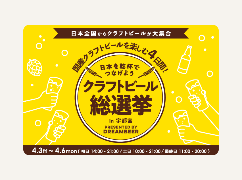 クラフトビール総選挙in宇都宮2026年4月3日(金)〜 4月6日(月)開催場所:宇都宮市オリオン市民広場>詳細はこちら |
